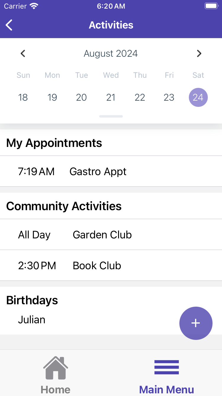 When logged into the app as a resident, seniors can access all of the community info that is available in the Community PIN version along with:
